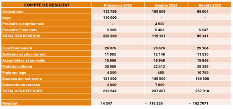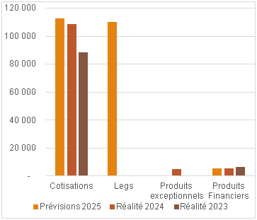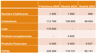 . Prévisions 2025 : Léger progrès prévu avec une augmentation du nombre d’adhérents et 110 000 € provenant des legs.
